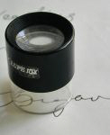 sammenligne forskellige bogstaver/detaljer. Ved selve undersøgelsen er det i første omgang lupper, der bliver brugt. Men det kan være nyttigt at udskrive to underskrifter f.eks. på et A3-ark for at kunne sammenligne og for at gøre notater. En scanner er derfor næsten uundværlig, også for at kunne indsætte de undersøgte bogstaver i erklæringen. Imidlertid er scanneren ikke god til tredimensionelle undersøgelser. Derfor kan et digitalt kamera være meget praktisk, idet man langt bedre på et foto kan se f.eks. tryk - og det er hurtigt og nemt!. Det bedste hertil er dog, stereomikroskopet, hvor man ved 60X tydeligt kan se, hvorledes skriften forløber, rystelser, og hvilken del af skriften, der er øverst (f.eks. ved overskrivninger). |